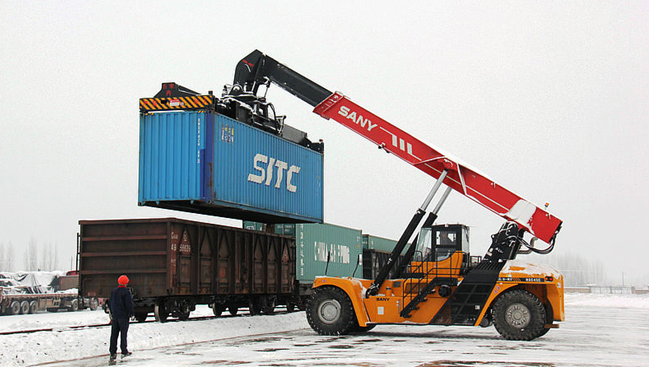 霍爾果斯鐵路貨場(chǎng)中的集裝箱裝車