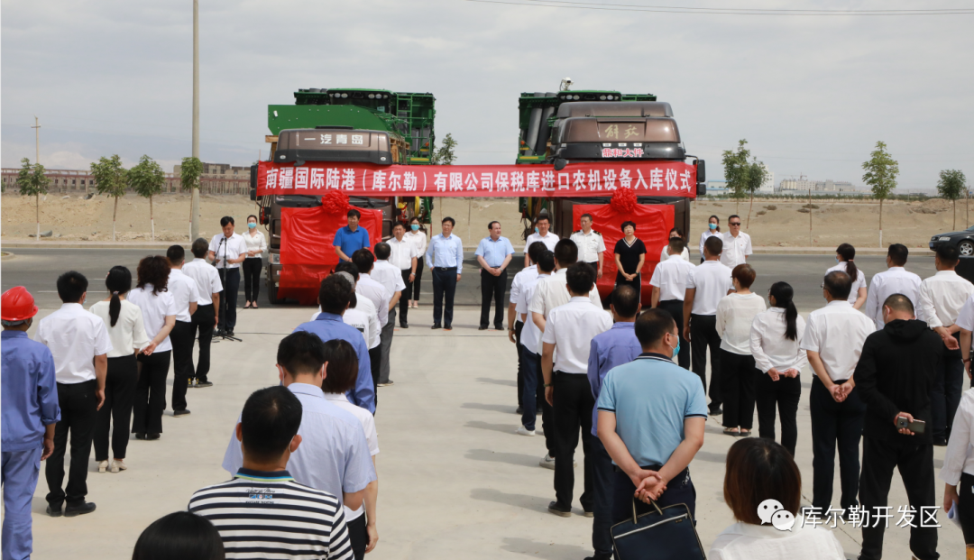 2020年6月11日,6臺CP690自走式大型采棉機(jī)“保稅運(yùn)輸”順利抵達(dá)南疆國際陸港(庫爾勒)有限公司公用型保稅倉庫,實(shí)現(xiàn)了南疆國際陸港(庫爾勒)有限公司與天津港海陸兩港聯(lián)動。