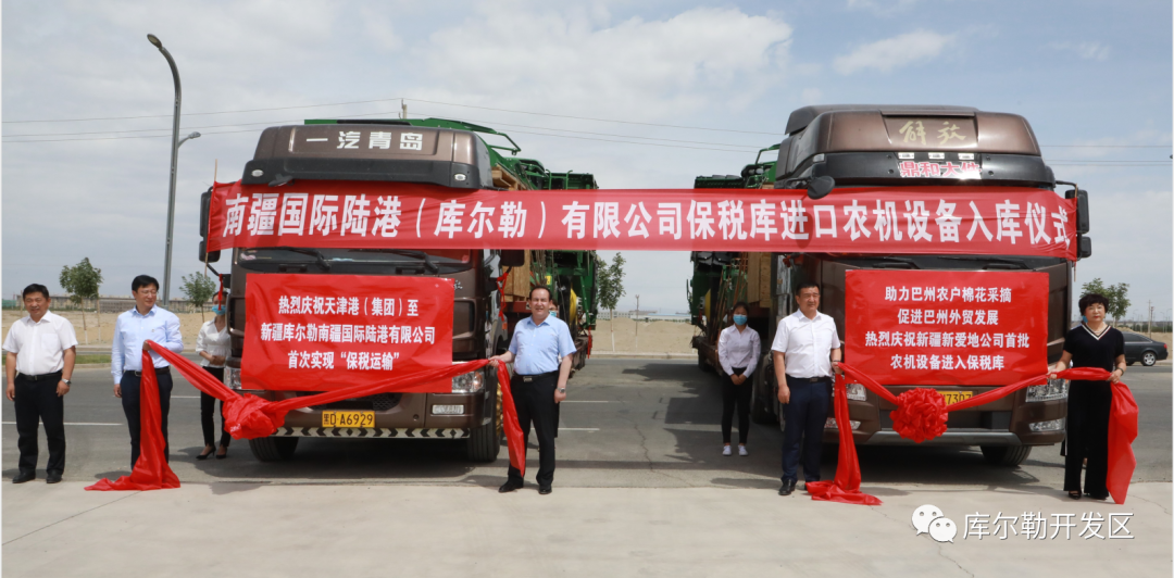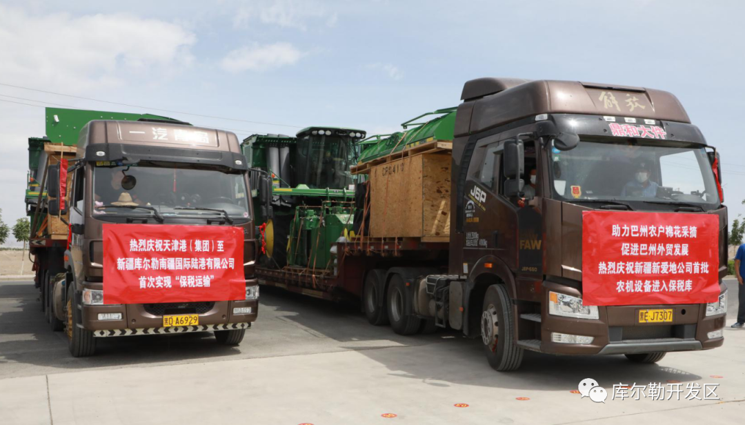 6臺CP690自走式大型采棉機(jī)及60箱配件,從天津港碼頭上岸,在新疆庫爾勒海關(guān)申報保稅放行,內(nèi)陸運(yùn)輸至南疆國際陸港(庫爾勒)有限公司公用型保稅倉庫。此項(xiàng)業(yè)務(wù)是新疆進(jìn)口摘棉機(jī)第一次采用內(nèi)陸保稅物流方式,也是南疆陸港保稅庫承接的首批進(jìn)口機(jī)械設(shè)備,該業(yè)務(wù)模式有效緩解進(jìn)口企業(yè)關(guān)稅資金壓力。
