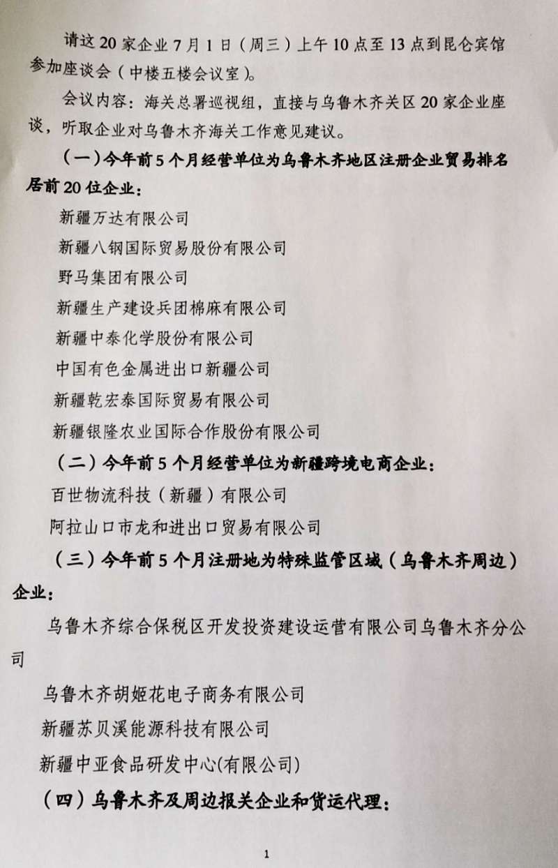 2020年7月1日上午10點(diǎn)-13點(diǎn),假新疆昆侖賓館中樓五樓會議室,海關(guān)總署黨委第九巡視組召開了巡視烏魯木齊海關(guān)后的第一次關(guān)企座談會。今年前五個月經(jīng)營單位為烏魯木齊地區(qū)注冊且企業(yè)貿(mào)易排名居前20位之內(nèi)的企業(yè)、今年前五個月經(jīng)營單位為新疆的跨境電商企業(yè)、今年前五個月注冊地為特殊監(jiān)管區(qū)域(烏魯木齊周邊)的企業(yè)、烏魯木齊周邊保管企業(yè)和貨運(yùn)代理企業(yè),共二十家單位均派出代表參會。會上,各位代表就今年疫情影響及應(yīng)對措施、面臨世界經(jīng)貿(mào)形勢持續(xù)走低壓力下的新疆企業(yè)如何走出困境、為促進(jìn)企業(yè)發(fā)展、關(guān)企寫作與互動等方面積極踴躍發(fā)言,提出了很多好的建議與意見?偸鹧惨暯M成員將上述給位代表提出的中肯意見和建議一一記錄在案,表示將協(xié)調(diào)烏魯木齊海關(guān)進(jìn)行充分溝通積極解決。